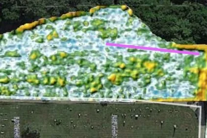 The GPR data was then cross-referenced with historic maps, records, and aerial photographs, confirming the previous existence of an old road that ran through the middle of the segregated section of the cemetery. According to the data, graves were historically plotted to the east and west of this roadway. While it is possible there were burials here prior to the roadway, the disturbance of those graves occurred when the road was built, and building on top of the existing roadway is the best way to minimize the memorial footprint. Given the age of the cemetery and the dates of the burials, the GPR report confirmed that any bodies that may be in the area for the planned memorial have decomposed and returned to the earth. In addition, the maximum digging depth for the walkway will be 8” and 36" for the two footing posts supporting the granite. This minimal depth ensures there will be no further disturbance or desecration of the souls laid to rest in the surrounding land. The pink line on the image, drawn out by the surveyors, indicates clear evidence of this former roadway and shows the location of where the memorial will be placed.